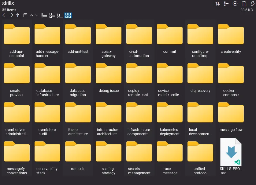 Ao todo foram 31 skills, algumas inclusive com resource, todos construídos com ajuda do Claude Code para serem usados pelo Claude Code com base em fragmentos da codebase.